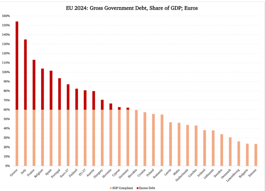 De fapt, toate statisticile relevante se opun creșterii împrumuturilor UE. Începând cu limita de îndatorare a uniunii, 14 dintre cele 27 de state membre încalcă în prezent limita de îndatorare de 60 % din PIB, consacrată în documentele fondatoare ale UE. Figura 1 prezintă datoriile care depășesc limita de 60 %, marcate cu roșu: