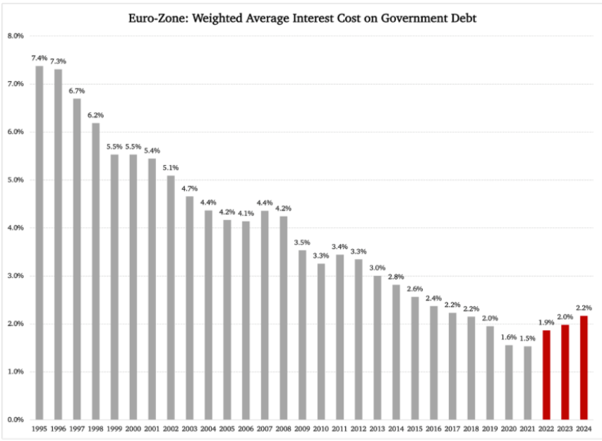 De remarcat că în ultimii trei ani costul mediu al dobânzii a crescut. Această creștere provine, desigur, dintr-un nivel extrem de scăzut, dar asta nu ușurează viața factorilor de decizie în materie de politică fiscală din statele membre îndatorate ale UE. Dimpotrivă: ratele scăzute cu care s-au obișnuit în ultimii ani au funcționat ca niște momeli, determinându-i să se îndatoreze și mai mult decât ar fi făcut-o în alte condiții. Ei și-au ajustat finanțele publice și politica fiscală pornind de la premisa că ratele dobânzilor vor rămâne scăzute în viitorul previzibil.