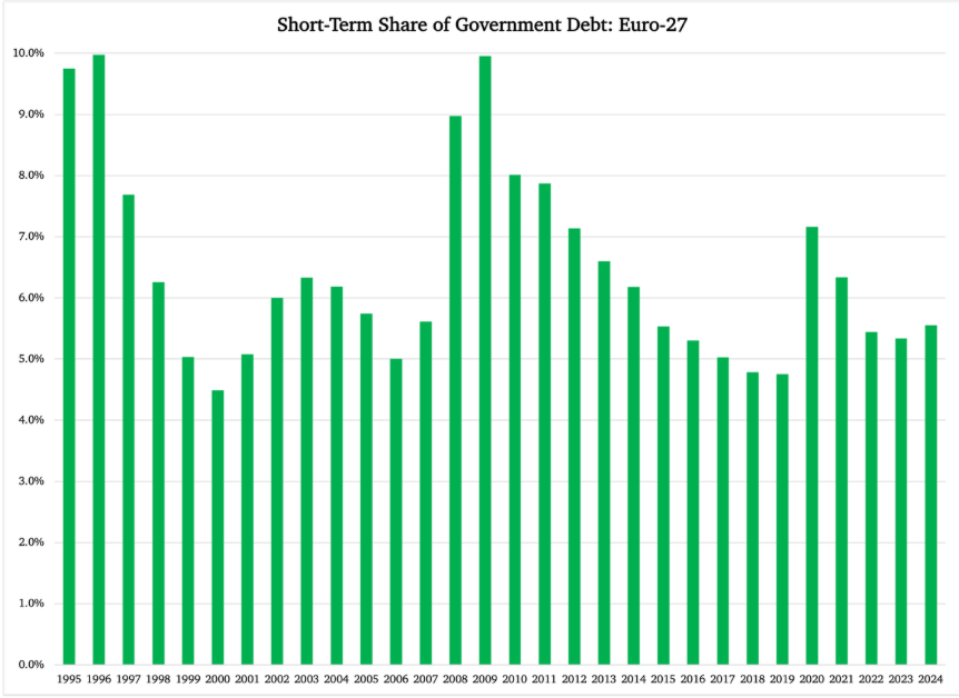 După Marea Recesiune de acum 15 ani, ponderea pe termen scurt a datoriei publice totale în UE a revenit la nivelurile scăzute anterioare. Acest lucru nu s-a întâmplat după pandemie: dimpotrivă, observăm o creștere foarte recentă a ponderii pe termen scurt în 2024.