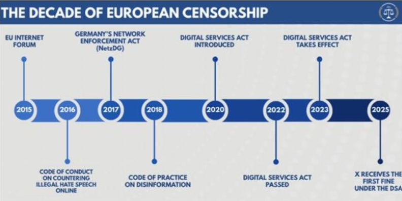 Începând cu Codul de conduită al Forumului Internet al UE (EUIF) din 2016 și continuând cu Legea serviciilor digitale (DSA) din 2023, Comisia Europeană a organizat peste 100 de întâlniri pentru a presiunea platformele să „cenzureze agresiv” conținutul, potrivit raportului Comitetului, „Amenințarea cenzurii străine, partea a II-a: Campania europeană de zece ani de cenzurare a internetului global și modul în care aceasta afectează libertatea de exprimare în Statele Unite”. Măsurile au fost prezentate ca fiind cooperante, dar comisia susține că e-mailurile interne arată contrariul. Raportul susține că