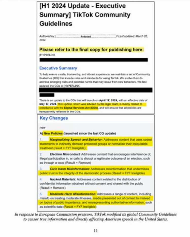 Conform unui raport provizoriu de 160 de pagini publicat pe 3 februarie 2026, documente nepublicate prezentate Comisiei Judiciare a Camerei Reprezentanților în urma unei citații dezvăluie că Comisia Europeană a exercitat cu succes presiuni asupra platformelor de socializare pentru a le determina să își modifice regulile globale de moderare a conținutului, afectând în mod direct libertatea de exprimare online a americanilor în SUA, conform American Thinker