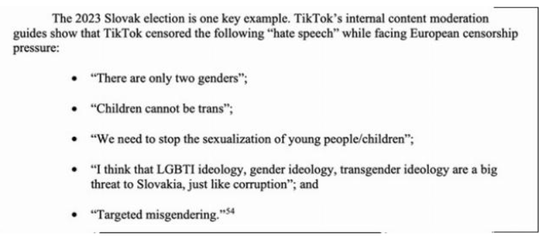 Raportul menționează, de asemenea, că UE „intervine în mod regulat” în alegerile naționale ale statelor membre ale UE, pretinzând că „controlează discursul politic în perioadele electorale”. Potrivit raportului, ar fi cenzurat conținutul înaintea alegerilor din Slovacia, Olanda, Franța, Moldova, România și Irlanda. Aceasta include cenzurarea discursului pe teme precum „migrația, schimbările climatice, securitatea și apărarea, precum și drepturile LGBTQ”. Din raportul prezentat mai jos, iată câteva exemple de cenzură înainte de alegerile slovace din 2023: